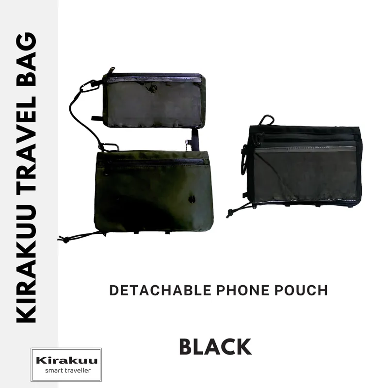 這款旅行袋還附帶一個可拆卸的電話袋,該袋具有觸控式屏幕,讓您無需取出手機即可使用。