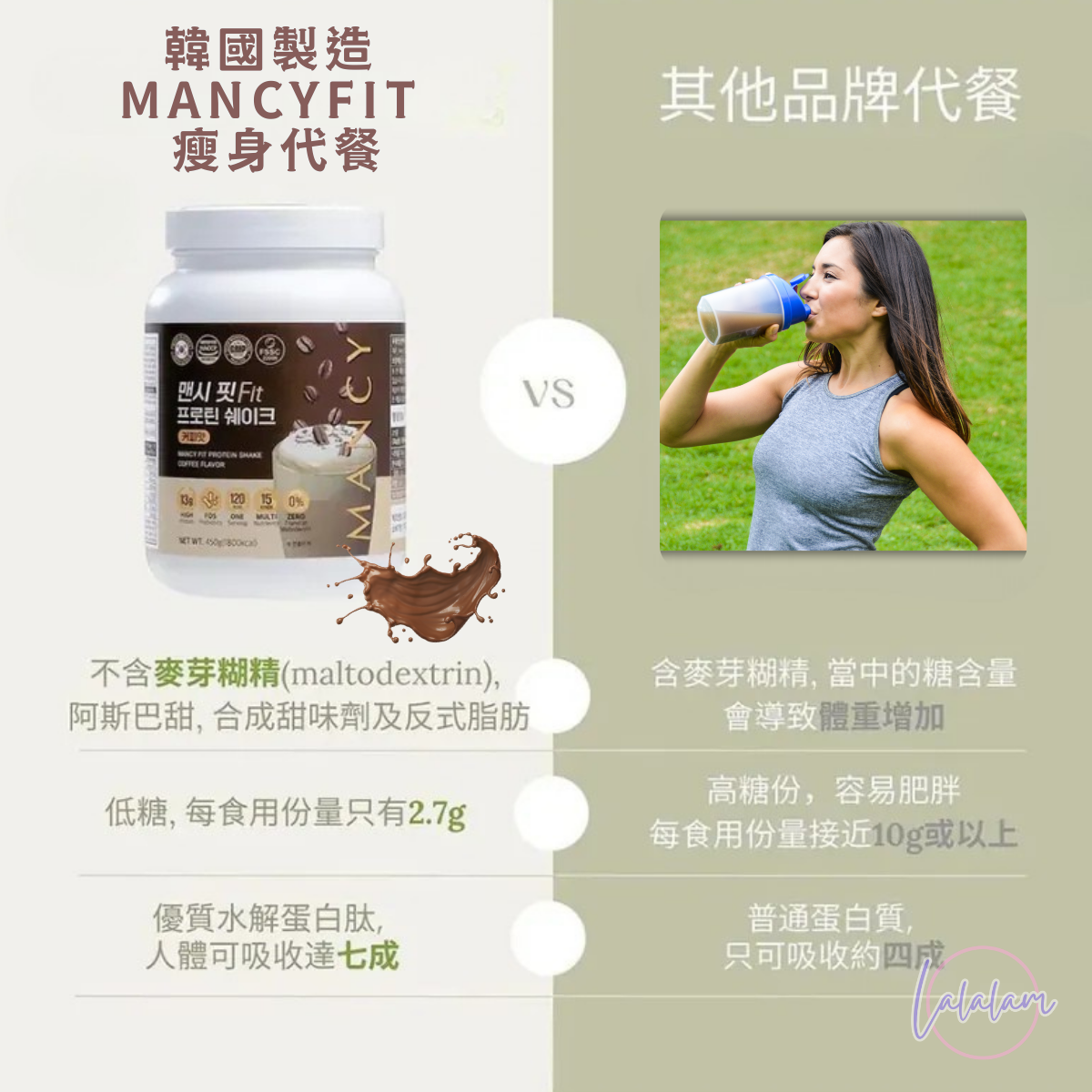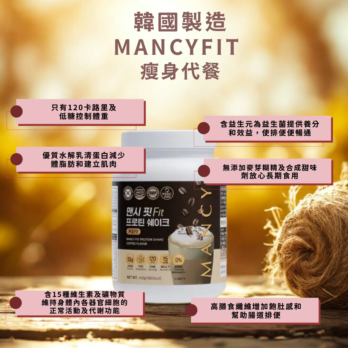 MANCYFit更可提供人體健康所需各種基本營養素,包括:優質的水解乳清蛋白肽、9種人體必需氨基酸、膳食纖維、益生元、多種維他命及礦物質等。絕對可彌補和補充日常飲食上營養不均衡的問題,為你提供一天所需能量及基本營養素,輕鬆瘦身,同時係營養補充品
