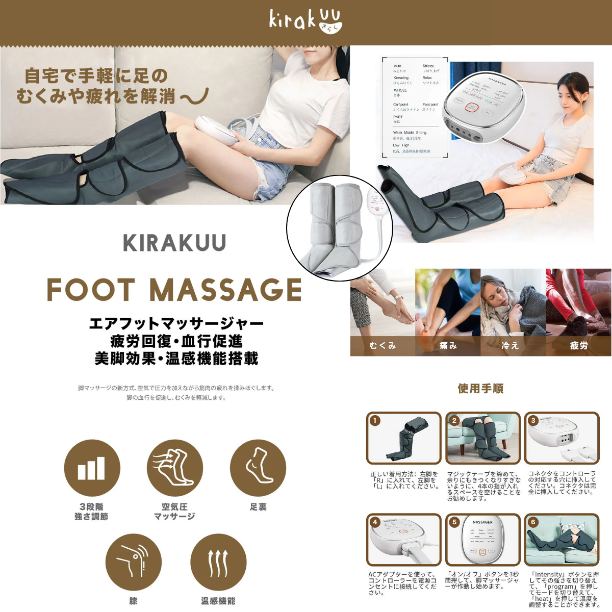 全方位氣壓式揉按,促進血液循環,從小腿到腳趾舒緩腳部疲勞及水腫, 可折疊易於收納及方便使用.