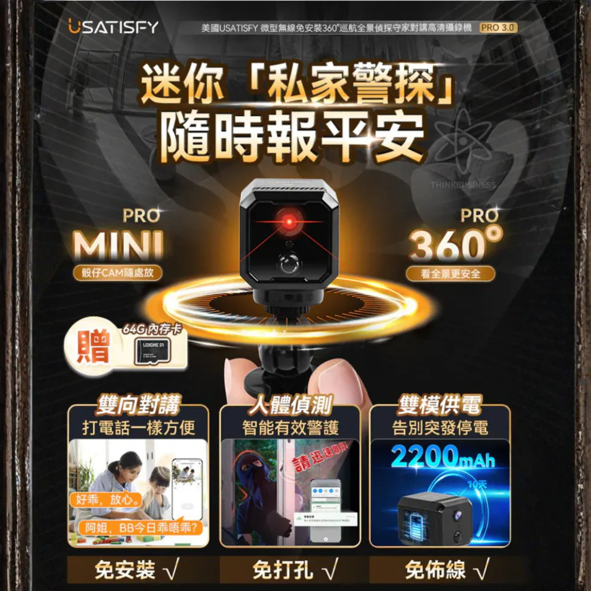 美國USATISFY 微型無線免安裝360°巡航全景偵探守家對講高清攝錄機Pro 3.0黑色默認規格默認型號【12/14 截單,預計 :12月尾至1月中發貨】】