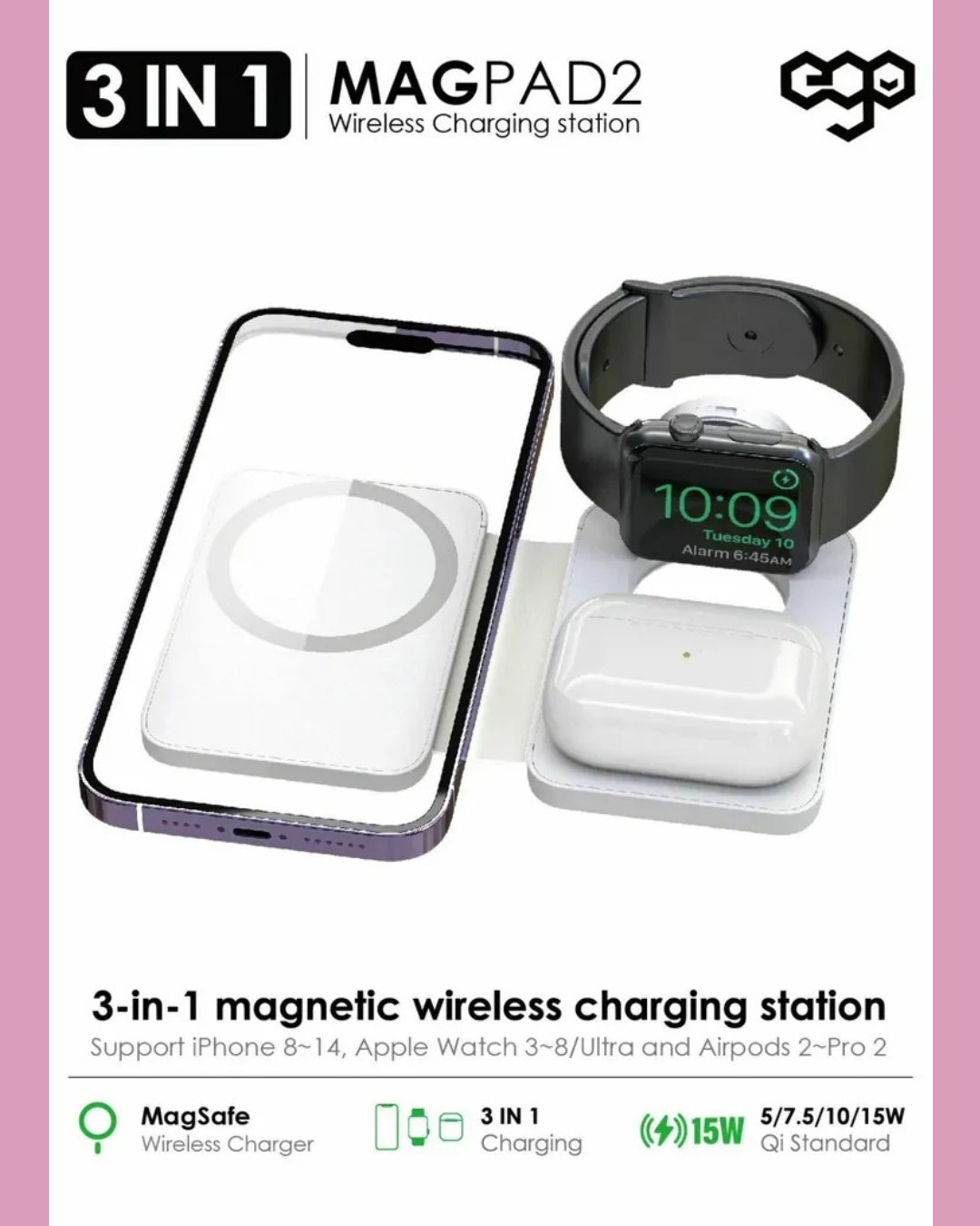 商品描述EGO 3in1 MAGPAD Magsafe 充電器史上最細最薄最輕便 3合1 全家桶!專為APPLE 用戶而設, 可為最新Apple Watch3~8,U, Airpods2~3/Pro, iPhone 8~14 進行快速無線充電。了解更多