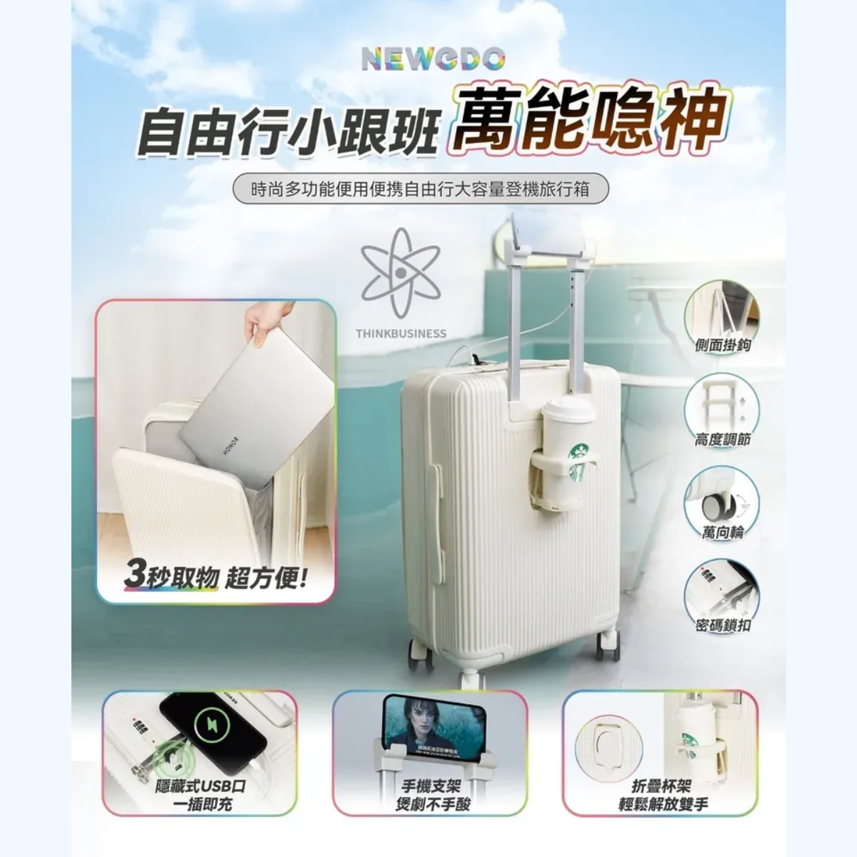 NEWCDO 萬能登機箱:時尚多功能旅行箱 | 解放雙手 | 輕鬆出行 | 外接USB充電|可折疊杯架【12/14截單,預計 :12月尾至1月中發貨】】
